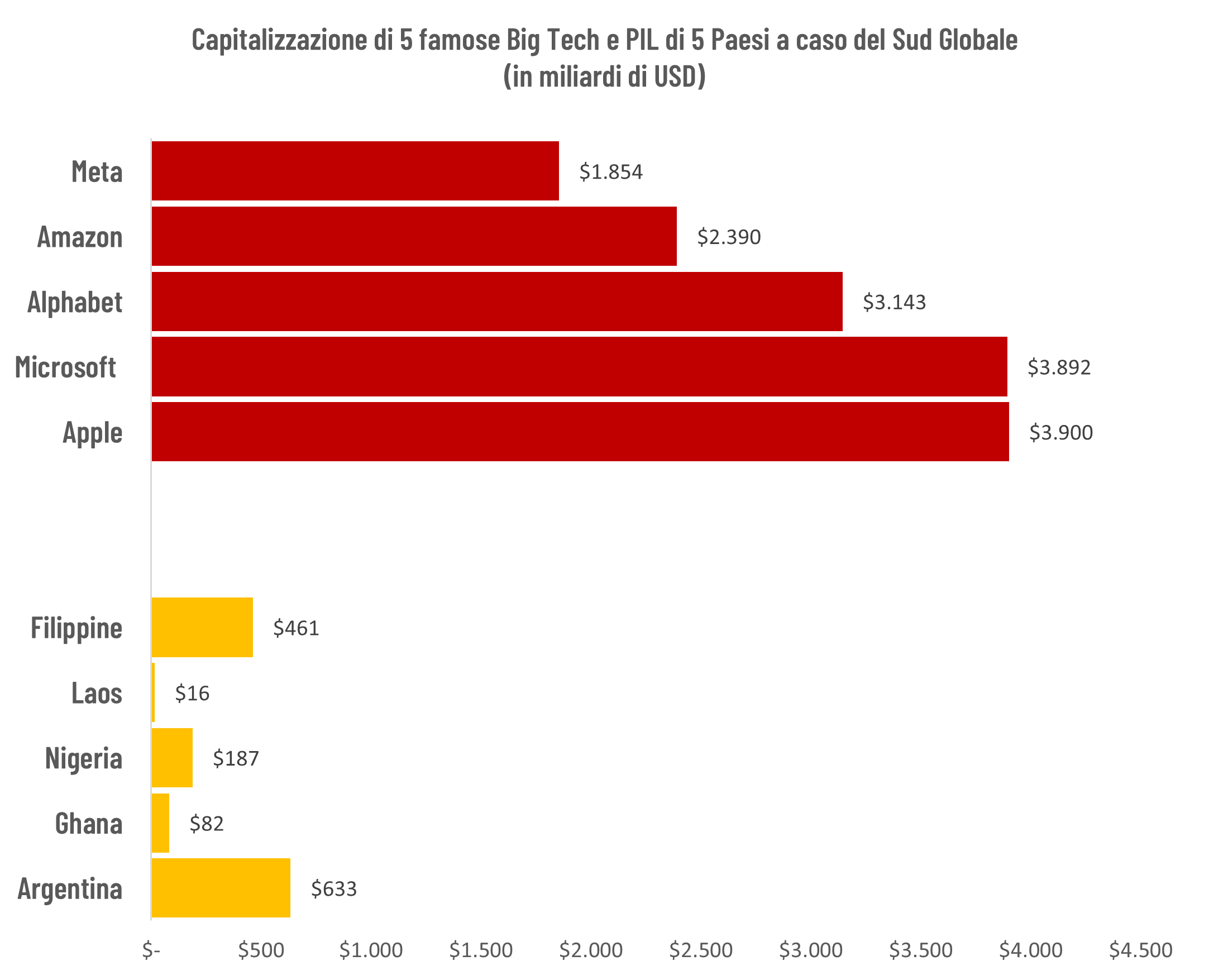 Mentre un manipolo di super ricchi, americani ed europei, si riempie pancia e tasche grazie a politiche fiscali favorevoli, il valore della capitalizzazione di 5 delle maggiori società tecnologiche americane - Amazon, Apple, Meta, Alphabet (Google), Microsoft - si aggira intorno ai 15 mila miliardi di dollari.